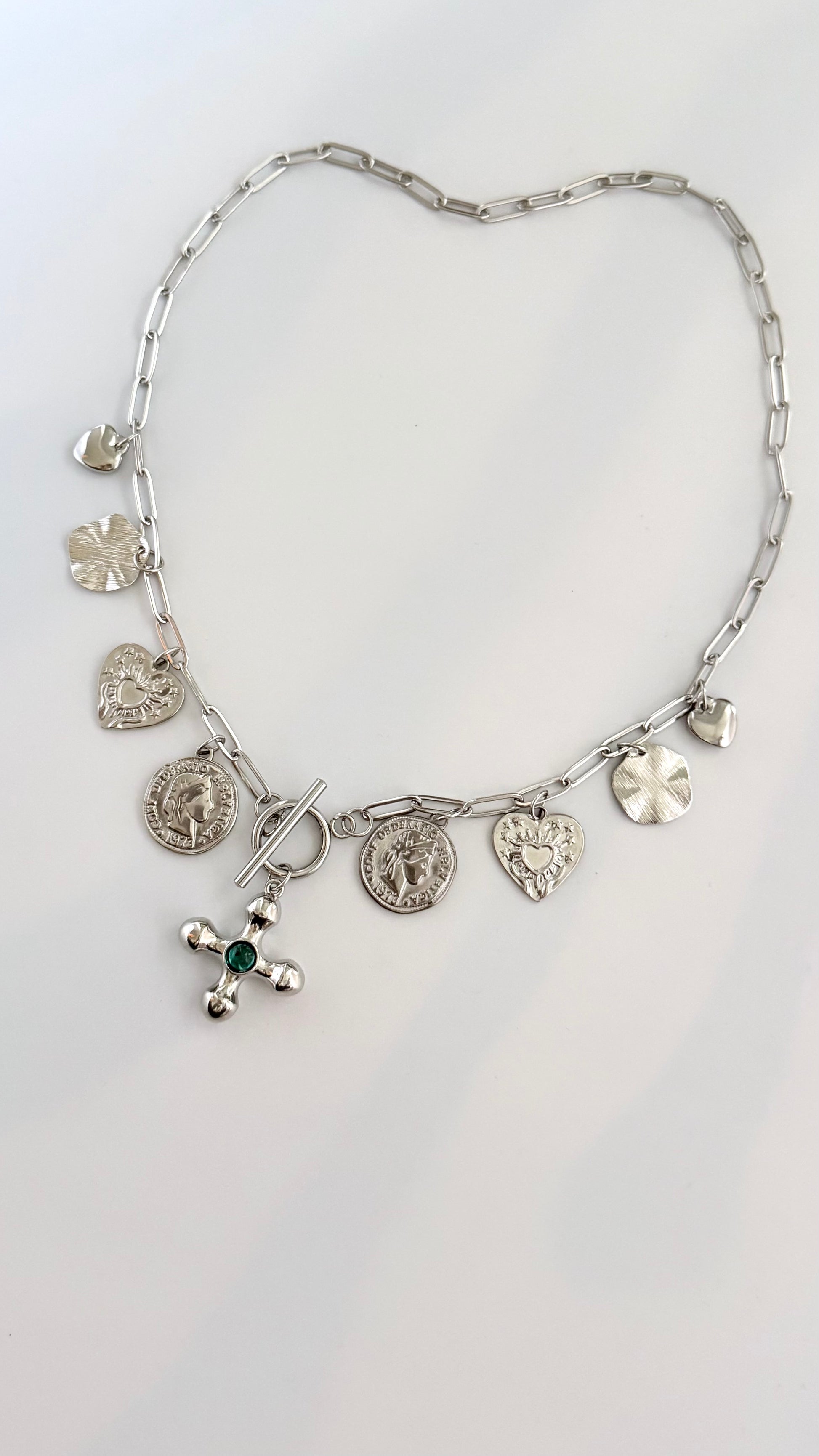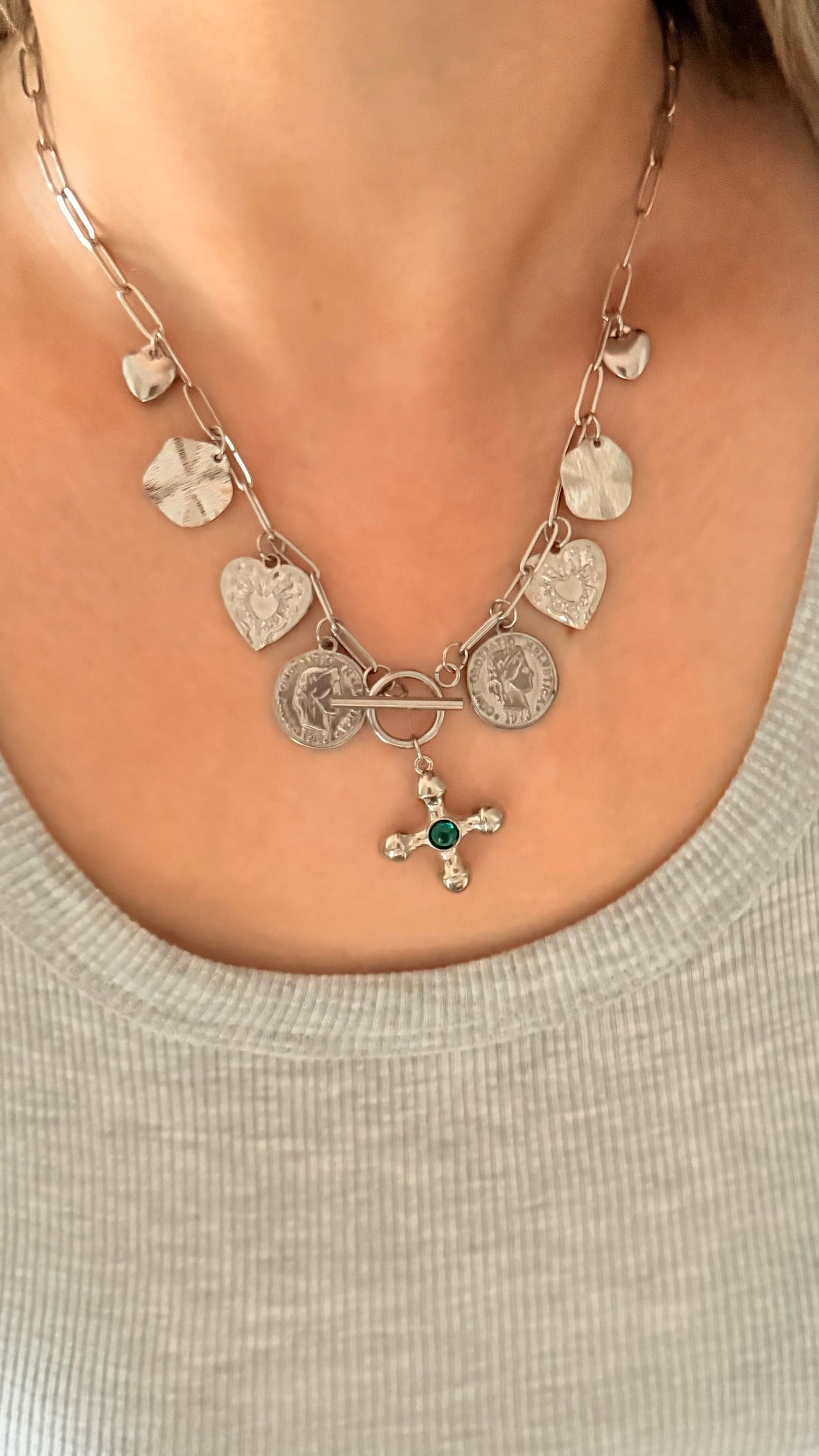 The Camilla Necklace is a unique piece that brings style and elegance together in a statement accessory. Featuring a stunning cross pendant with a green quartz centre that hangs effortlessly from a classic T-bar closure, this necklace is accentuated by delicate coin charms on each side for perfect symmetry, along with charming heart accents.