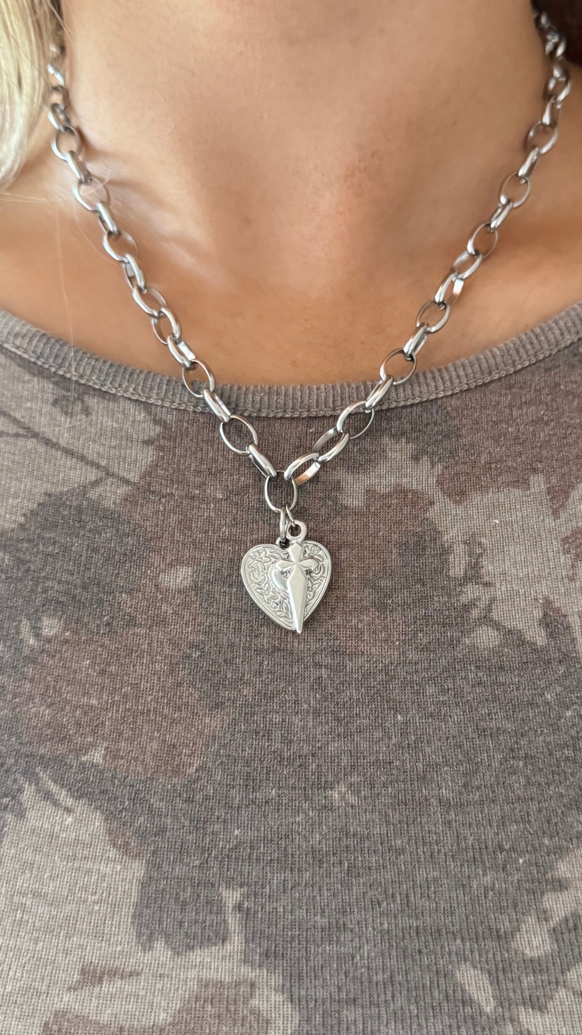The Lovestruck Necklace blends soft and sharp in a simple, easy-to-style way. Featuring an engraved heart charm with a sleek sword pendant, it creates a balanced contrast that works effortlessly with everyday streetwear or a more dressed-up look.