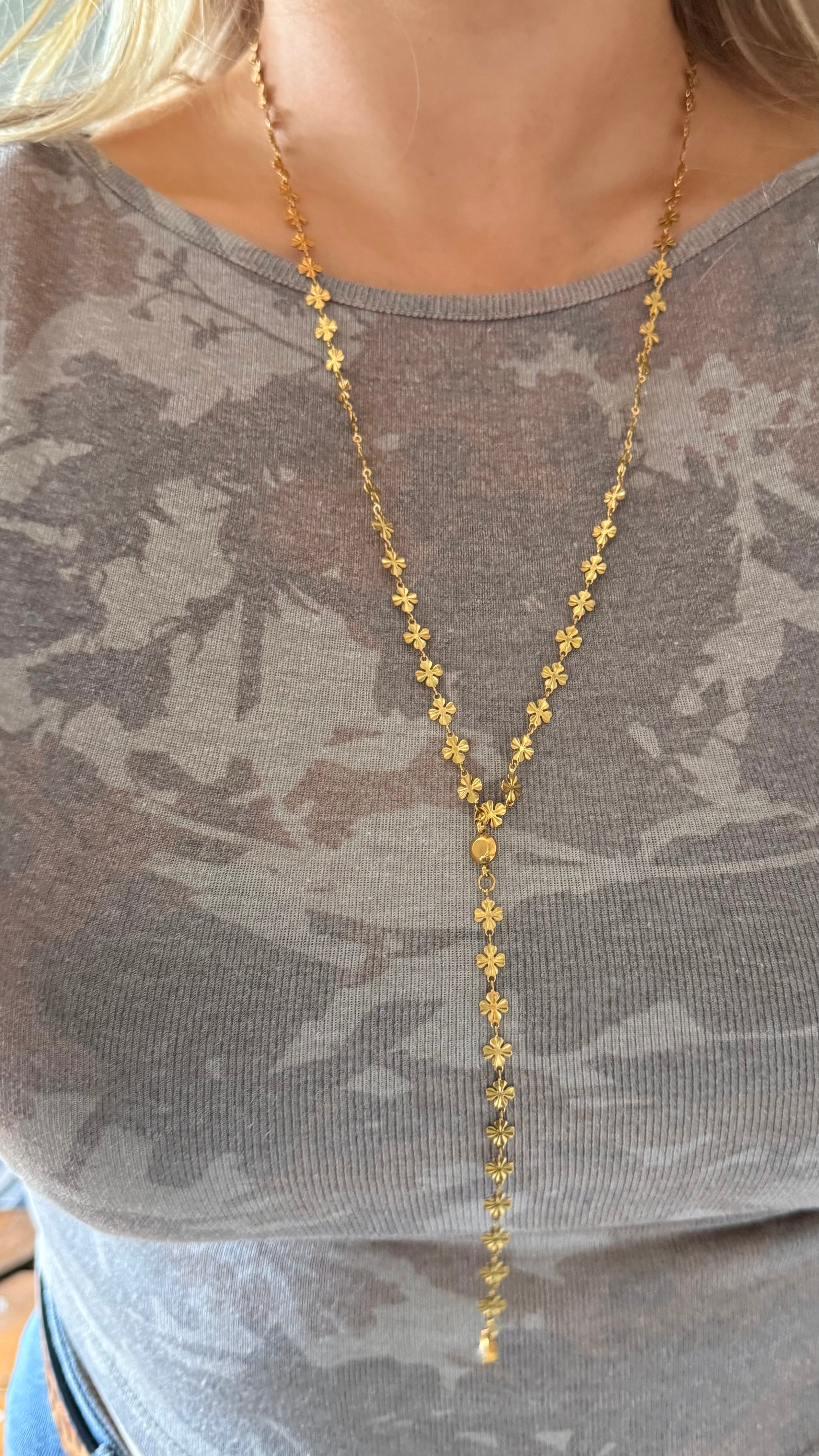 The Lucky Girl Lariat Necklace features a sleek clover-link pattern that drops into a long, effortless Y-shape, giving that cool-girl, off-duty look without even trying.