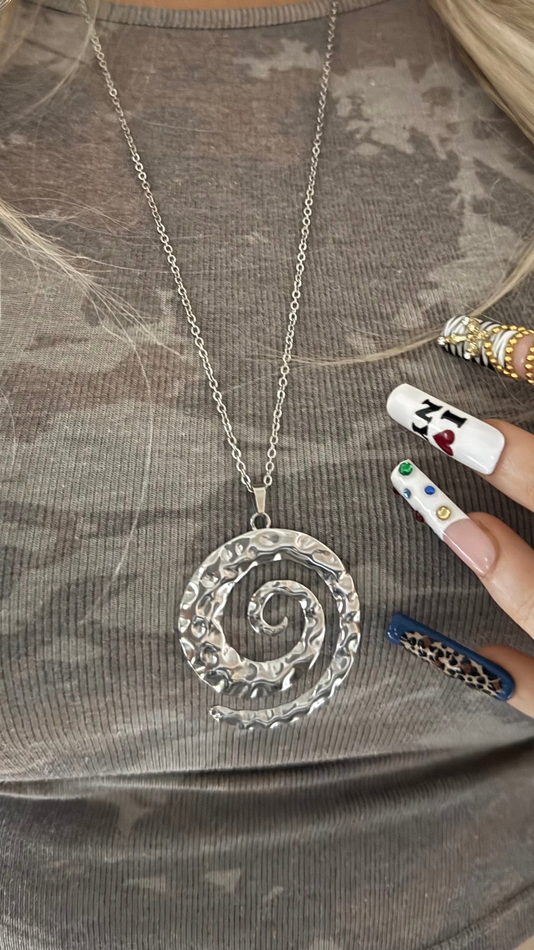 The Hot Girl Spiral is that effortless statement piece you throw on and instantly feel put-together. Featuring a hammered metal spiral pendant on a long 26–30 inch chain, this necklace gives a bold, sculptural look without trying too hard. The extra length makes it perfect for layering over tees, tanks, hoodies, dresses — whatever you’re calling a fit that day.
