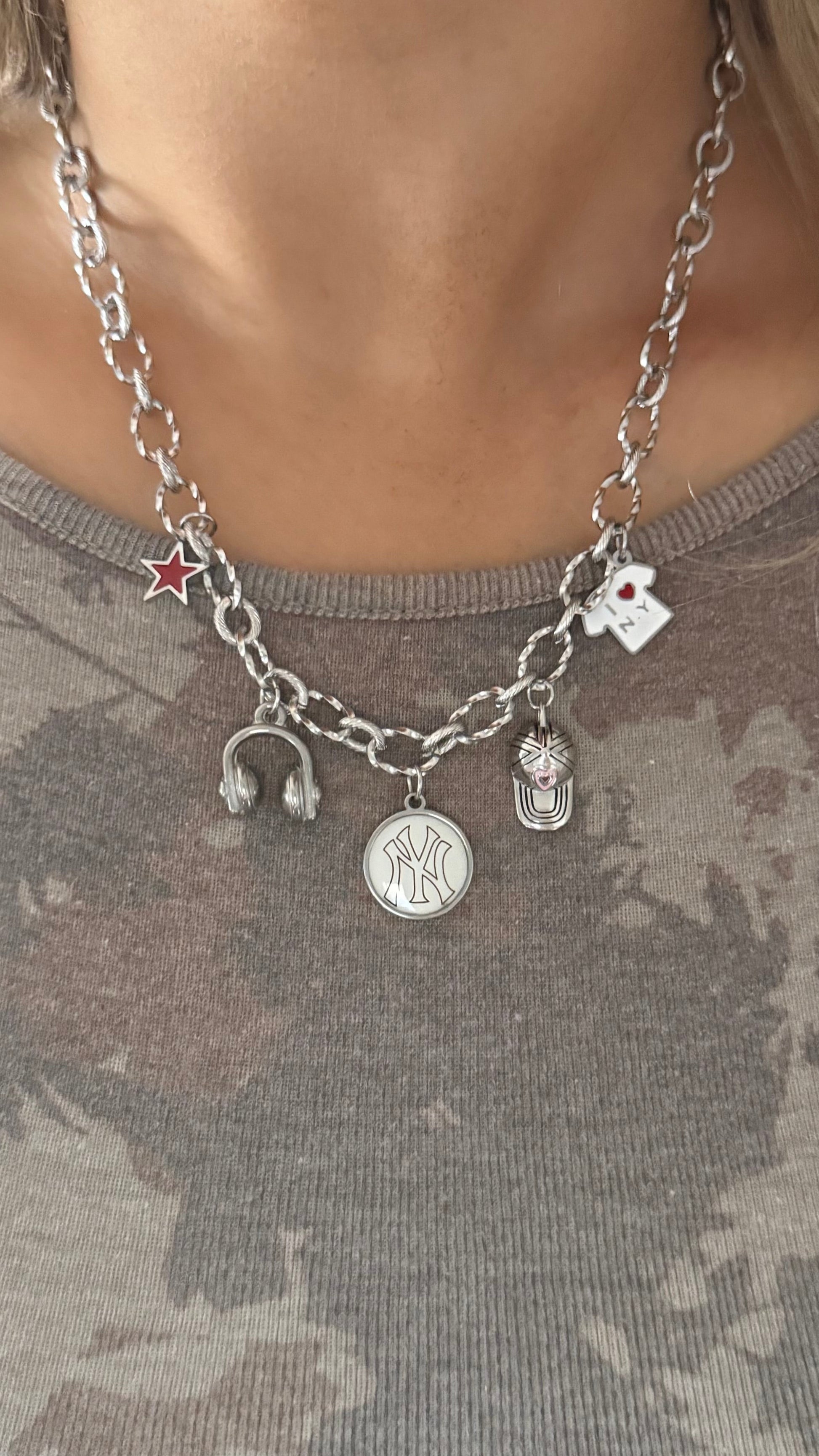 Think of this as the streetwear girl starter kit — but make it a necklace. The Streetwear Icon wraps all your go-to pieces into one cute, chunky charm chain. It features a handmade-by-me stainless steel resin NYY charm, mini headphones, a glossy red star, a tiny baseball cap, and an I ❤️ NY tee — basically everything you’d throw on for the perfect fit, now sitting around your neck.