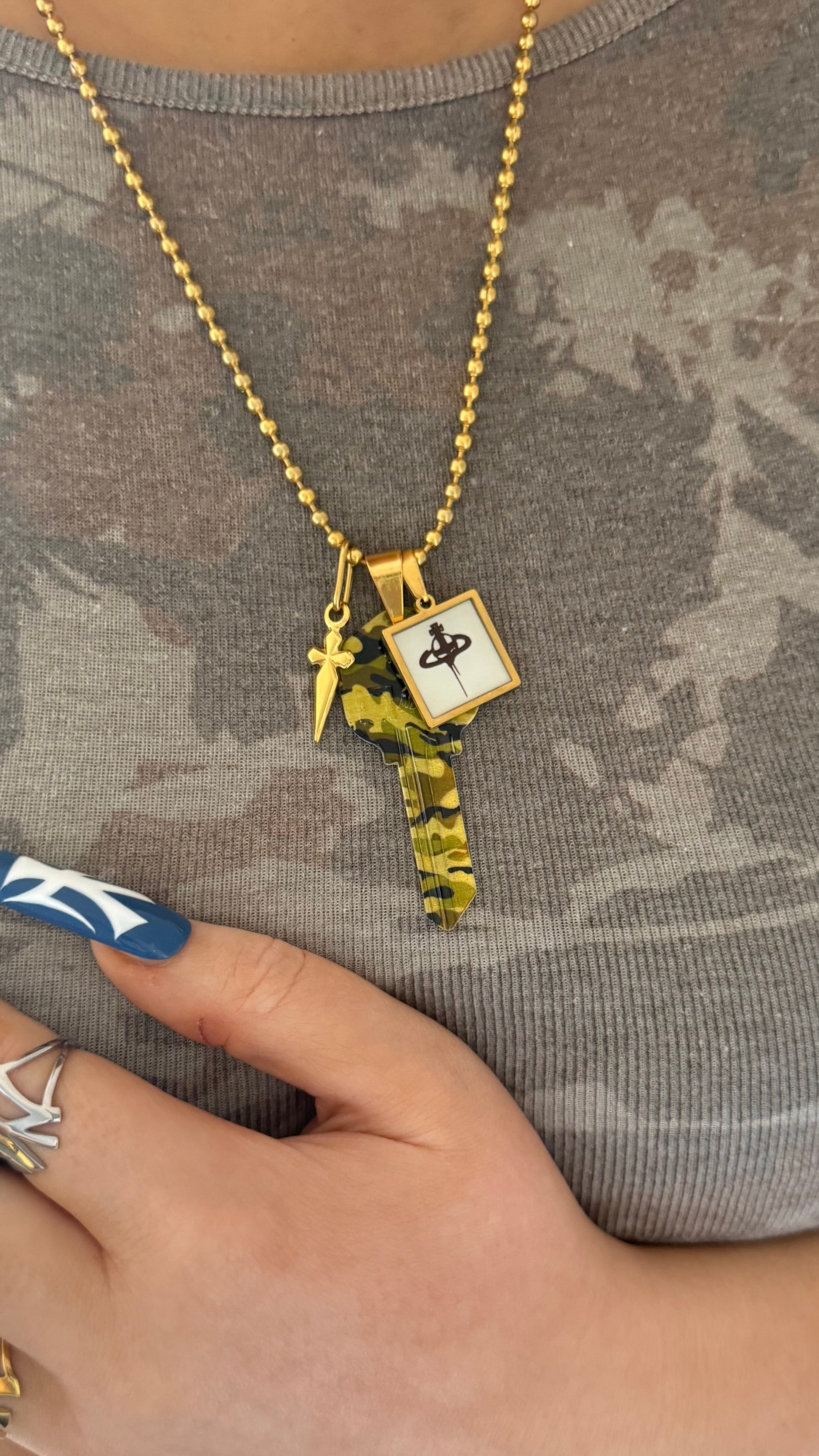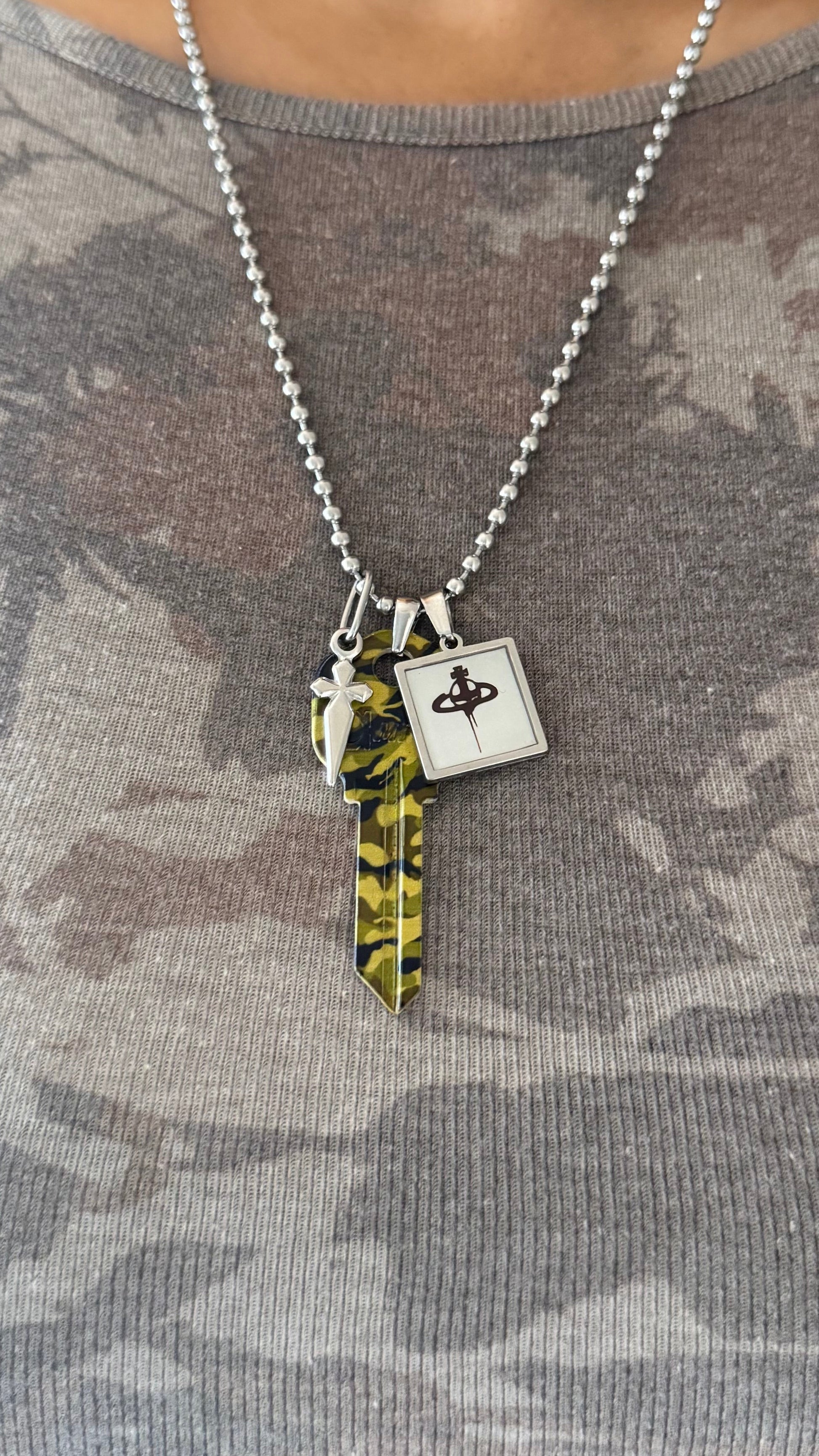 The Unlock the Camo Charm Necklace brings together three sharp, street-ready elements: a camo key pendant, a slim sword charm, and a custom handmade resin halo charm. Built on a stainless steel ball chain, it has that curated, mixed-metal feel that sits perfectly with oversized tees, cargos, hoodies, and anything with a bit of attitude.