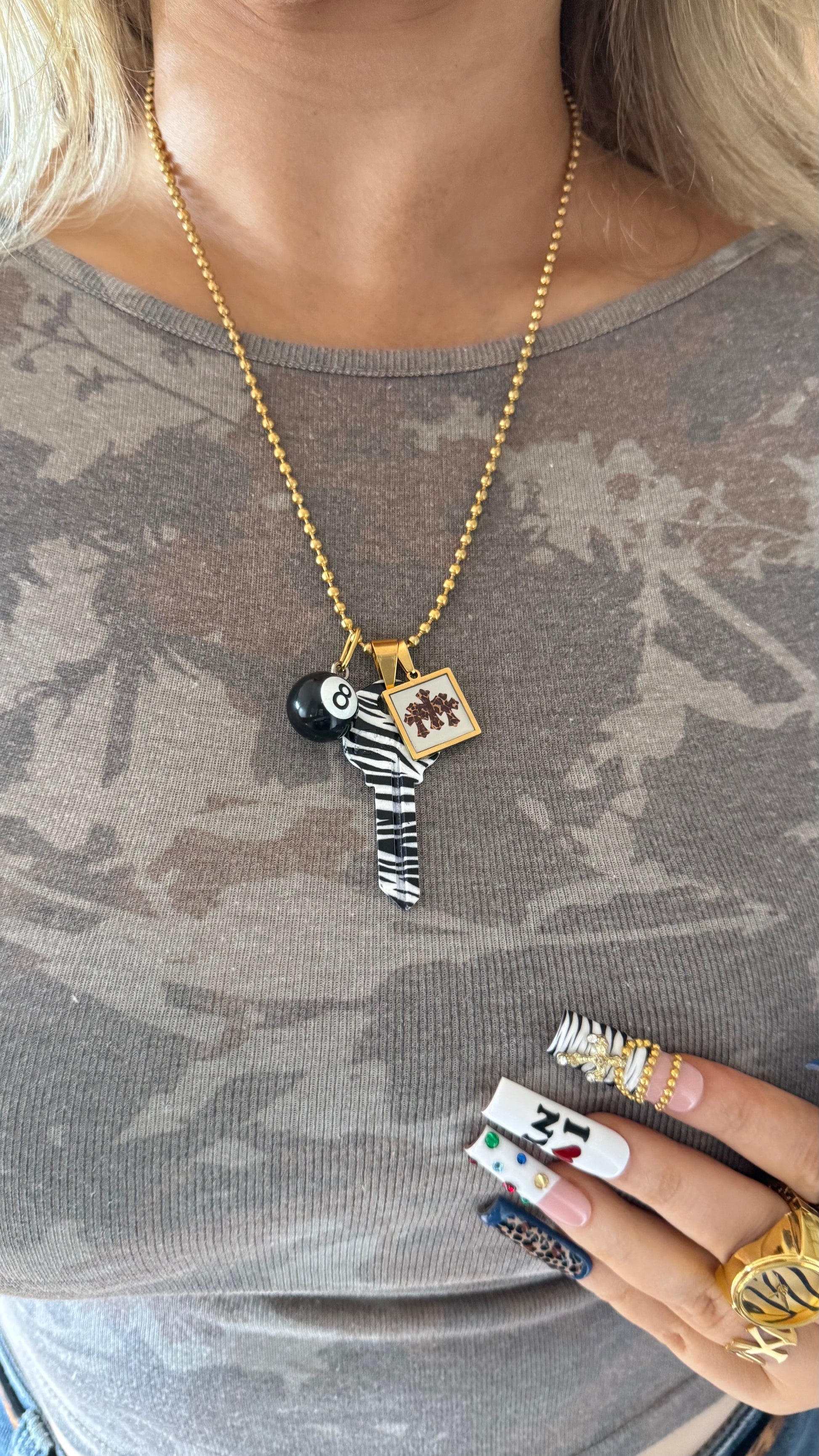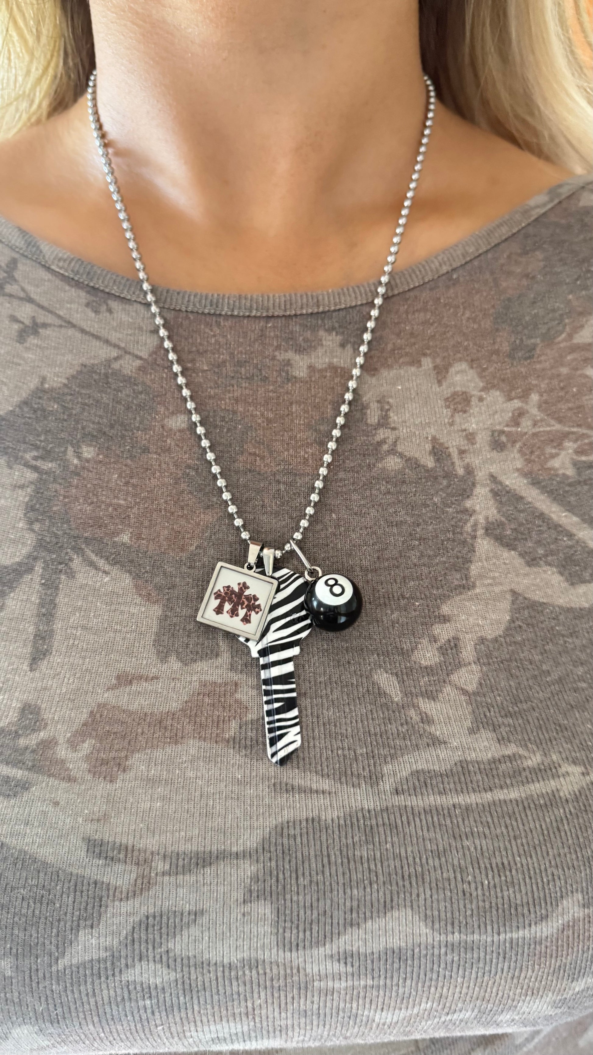 The Zebra Crossing Necklace mixes bold pattern and street-style detailing in a way that feels instantly curated. Featuring a zebra-print key charm, an 8-ball accent, and a custom resin piece, this necklace brings together contrasting shapes and textures for a look that stands out without being loud.